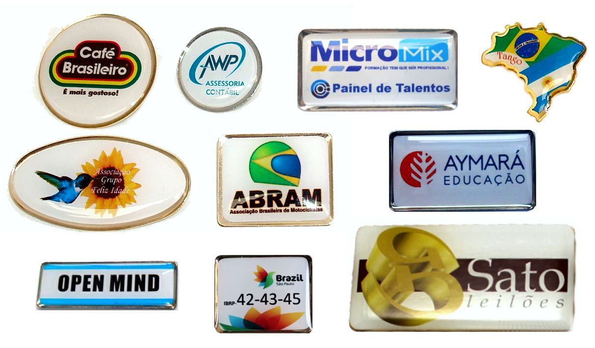 O boton crachá com gravação digital resinada facilita quando se precisa gravar detalhes e muitas cores. É fabricado em latão ou ferro com aplicação de banho fash de ouro ou niquelado O fecho pode ser alfinete, borboleta ou imã.
